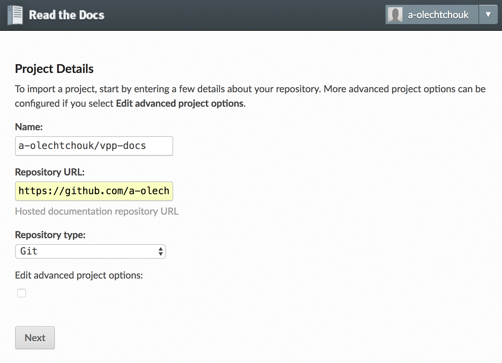 This will bring you to a page that asks for your repo details. Set “Name” to your forked repo name, or whatever you want. Set “Repository URL” to the URL of your forked repo (https://github.com/YOURUSERNAME/vpp-docs). “Repository type” should already be selected to “Git”. Then click “Next”.