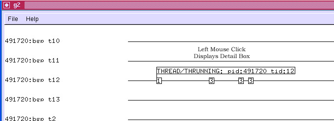 Note that event detail boxes previously shown, but suppressed due to deselection of the event code will reappear when one reselects the event code. In the example above, the “THREAD/THREADY pid:491720 tid:12” detail box appears in this fashion.