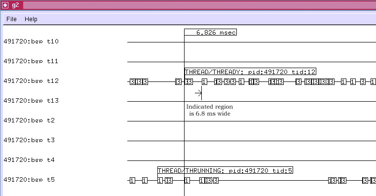 Summary mode declutters the screen by rendering events as short vertical line segments instead of numbered boxes. Event detail display is unaffected. G2 starts in summary mode, zoomed out sufficiently for all events in the trace to be displayed. Given a large number of events, summary mode reduces initial screen-paint time to a tolerable value. Once you’ve zoomed in sufficiently, type “e” - enter event mode, to enable boxed numeric event display.