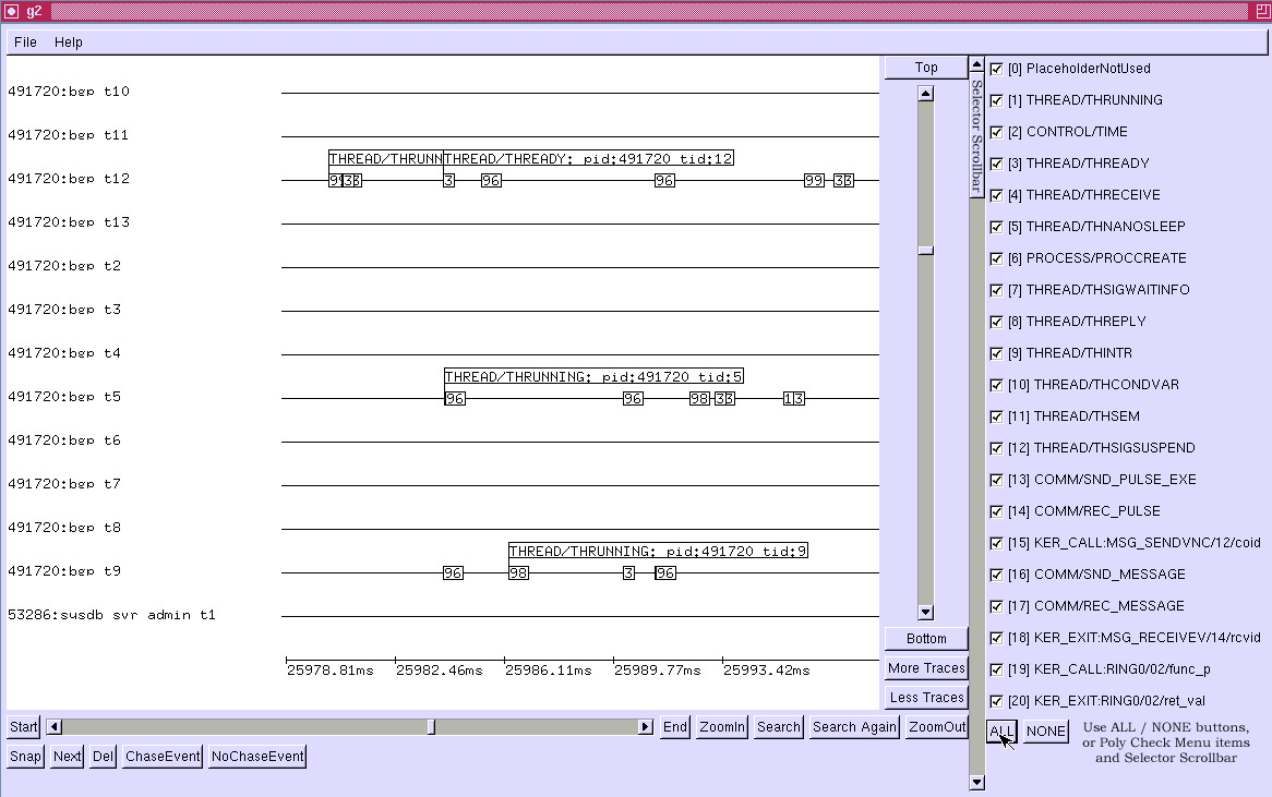 Event chasing sorts the trace axis by occurrence of the last selected event. For example, if one selects an event which means “thread running on the CPU” the first N displayed traces will be the first M threads to run (N <= M; a thread may run more than once. This feature addresses analytic problems caused by the finite size of the drawing area.